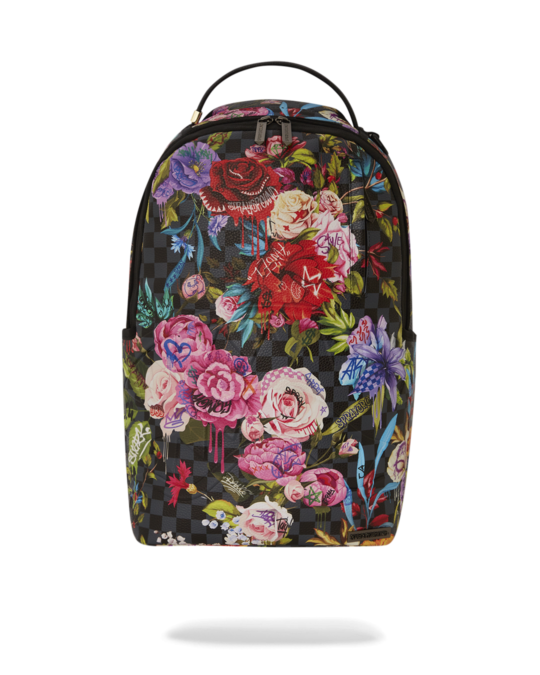 Dimensions: 18' x 6' x 11.5' • Front zipper pocket • Side pockets • Zippered Stash pocket • Separate velour sunglass compartment • Ergonomic mesh back padding • Adjustable Straps for custom sizing • Gold zippers with metal hardware • Metal 'Sprayground Authentic' badge • Slide through back sleeve connects to carry-on luggage to free your hands