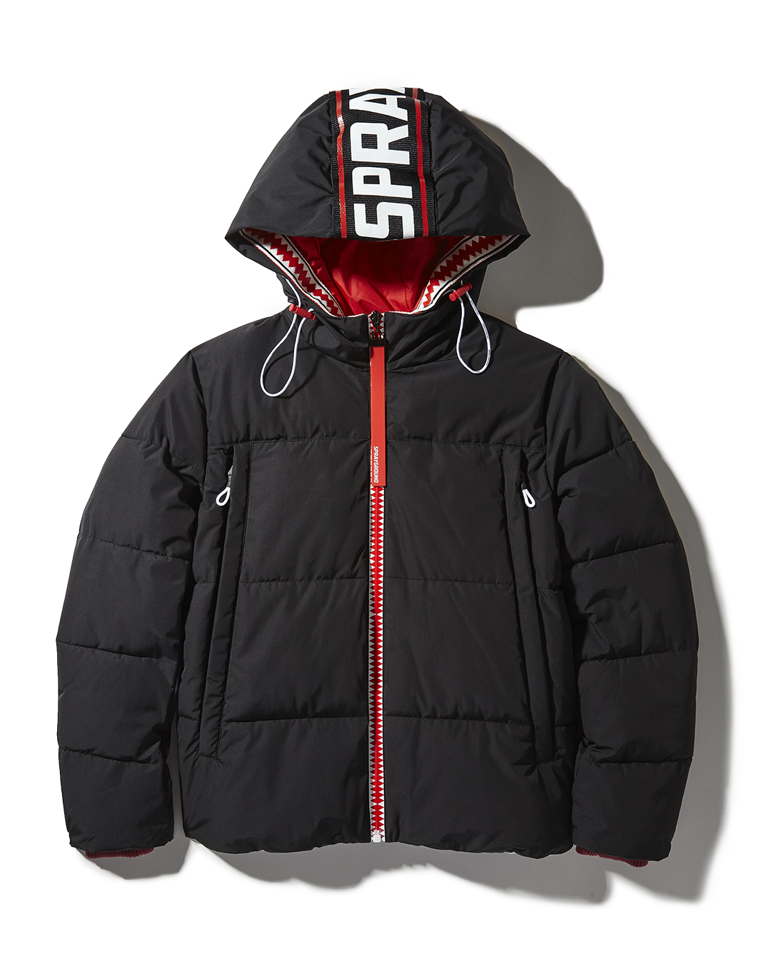 EXTRA MAT NYLON FABRIC; SPRAYGROUND LOGO SILICON ZIPPER; REAR LARGE BLACK SHARKMOUTH PATCH; SPRAYGROUND LOGO ELASTIC WIRE + KNOTTED CORDS; LOGO PRINT ON REMOVABLE HOOD